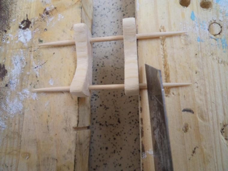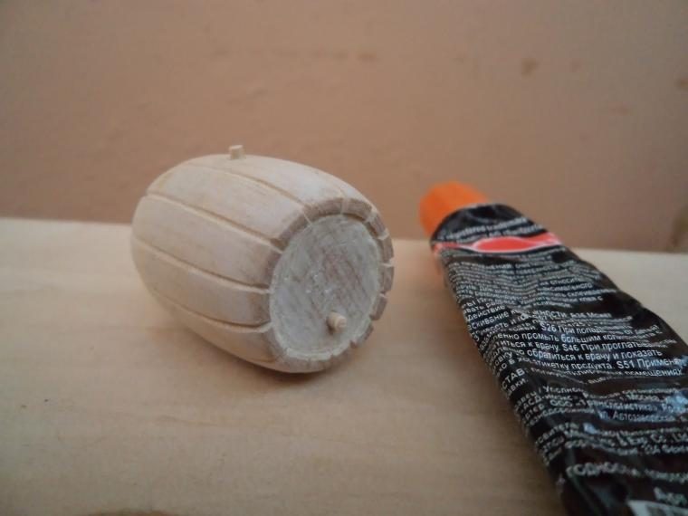 Затем в полученные отверстия устанавливаем зубочистки. Заготовки друг от друга должны распологаться на таком расстоянии, чтобы четко попадать между пар обручей бочки (фото ниже).