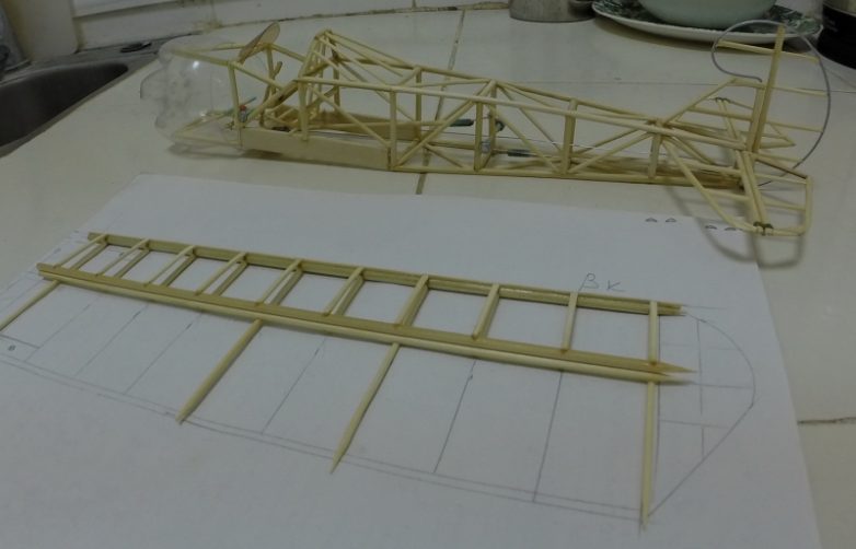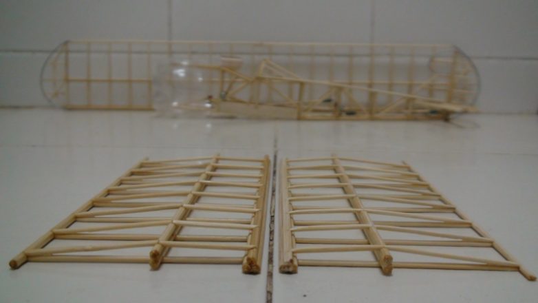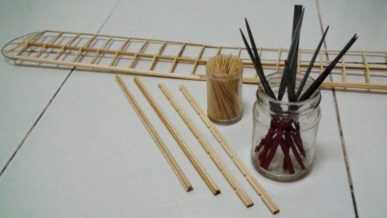 Передняя кромка – склейка из трёх барбекюшных палочек. Лонжерон из двух. Задняя кромка – одна. Нервюры – зубочистки. После склейки обработать надфилями. Крылья состоят из левой и правой половин – по максимальной длине барби-палок.
