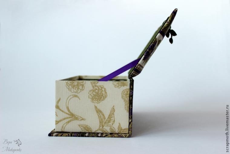 Ткань полностью закрывает картон. В готовой шкатулке нигде не должно быть просветов.Везде, где это возможно, избегаем открытых срезов. Я покажу, как их можно сделать, чтобы они не осыпались, но применять это можно только на неподвижных элементах. Во всех остальных случаях ткань подворачиваем. Желательно так, чтобы минимизировать толщину складок.Клей наносим тонким равномерным слоем, чтобы он не проступал через ткань на лицевую сторону. Если это произошло, промокните пострадавший участок влажной тряпочкой. Несколько раз, пока не уберете все излишки. Полностью убрать клей можно далеко не с каждой ткани, поэтому лучше таких промашек не допускать.
