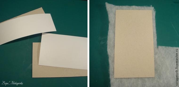 Обложка у нас состоит из трех деталей: дно, крышка и корешок. Крышка будет с прослойкой синтепона. Дно и корешок — как и остальные детали с прослойкой из белой бумаги. Кстати, это единственный момент в шкатулке, где я сначала клею бумагу к картону, а только потом уже — ткань. Что касается обложки, я слегка промазываю ее клеем и прикладываю к синтепону. Клей нужен для того, чтобы синтепон не ерзал. Обрезаю лишнее роллерным ножом.