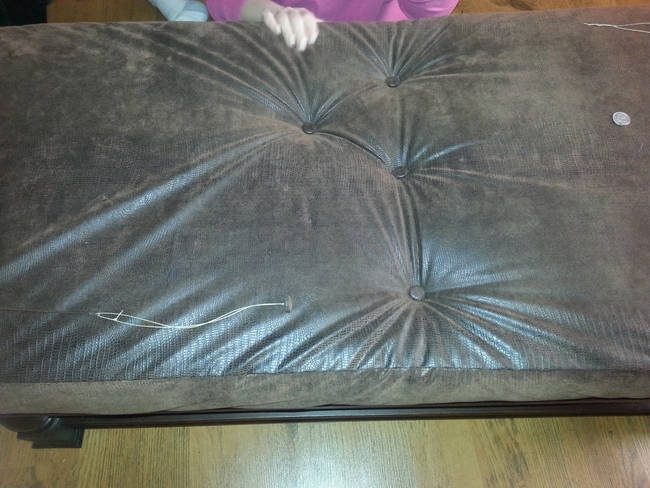 Обтянул тканью, напоминающую кожу, и пришил пуговицы. Затем шнуры с надетыми на них пуговицами плотно затянул, а с изнаночной стороны концы шнуров закрепил степлером