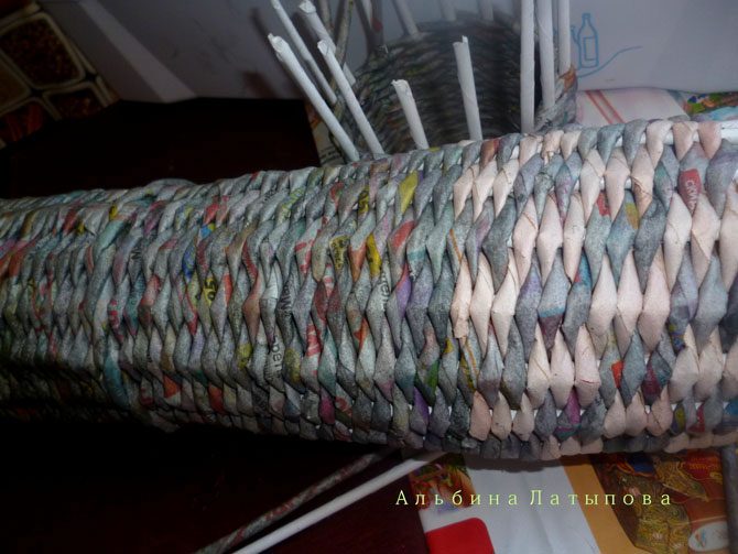 Важно было не увлекаться и примерно через 10 см изнутри тщательно покрывать лаком, после чего продолжать плетение. Основной узор «верёвочка» из двух трубочек.