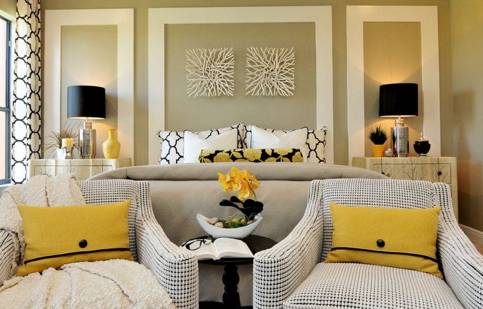 Современная спальня, украшенная простыми, но выразительными картинами.