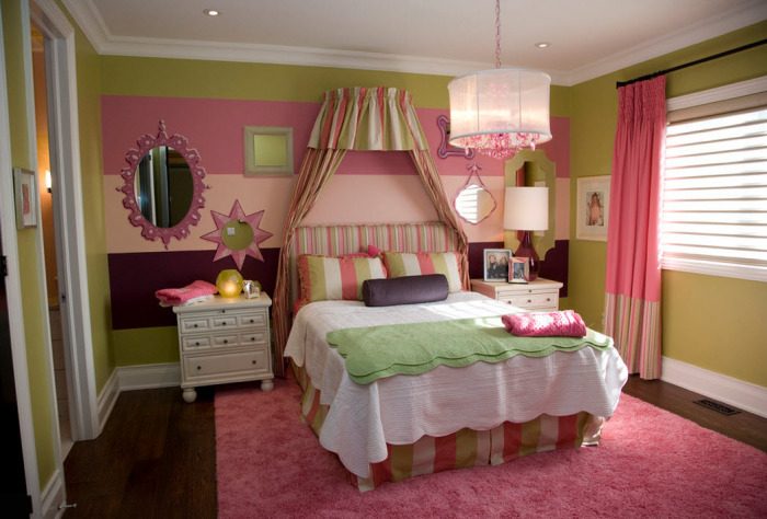 Невероятно девчачья спальня с кроватью с балдахином и яркими стенами.