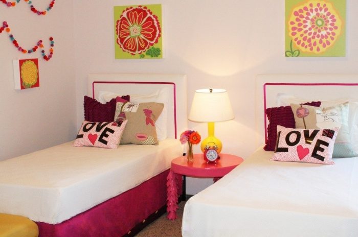 Современная спальня для двух девочек с похожими декорациями возле каждой кровати.