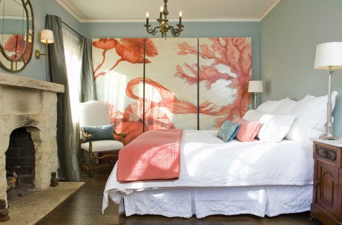 Прекрасная спальня для девочки, украшенная огромной картиной в нежном коралловом цвете.