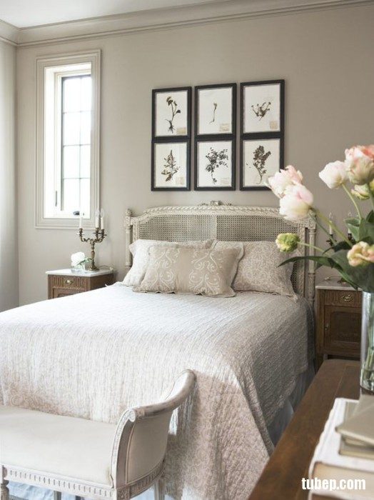 Стена над изголовьем кровати в традиционной спальне, украшенная шестью идентичными картинами.