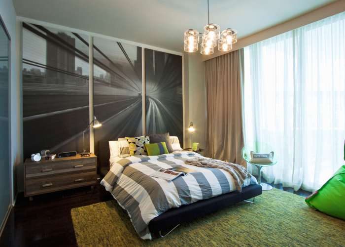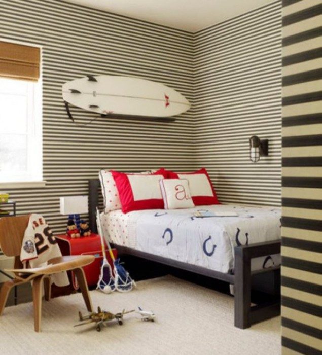 Спальня для мальчика с доской над головой и полосатыми стенами — прямой путь в дурку.