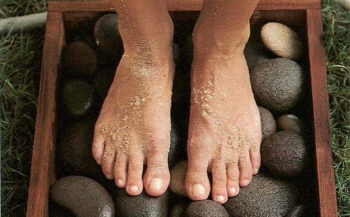 Приятно походить по двору босиком, но идти в дом грязными ногами не стоит. После игр или занятий в саду их можно не вымыть прямо во дворе. Сбивается деревянная рама, покрывается влагостойким герметиком, наполняется гладкими камнями и устанавливается рядом с входной дверью. Теперь можно вымыть ноги и руки и одновременно сделать расслабляющий массаж.