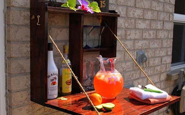 Используя бывший шкафчик, можно соорудить мини бар с напитками и набором стаканчиков. Лучше установить опускающуюся дверцу, которая фиксируется двумя веревками. Так можно будет получить импровизированный столик.