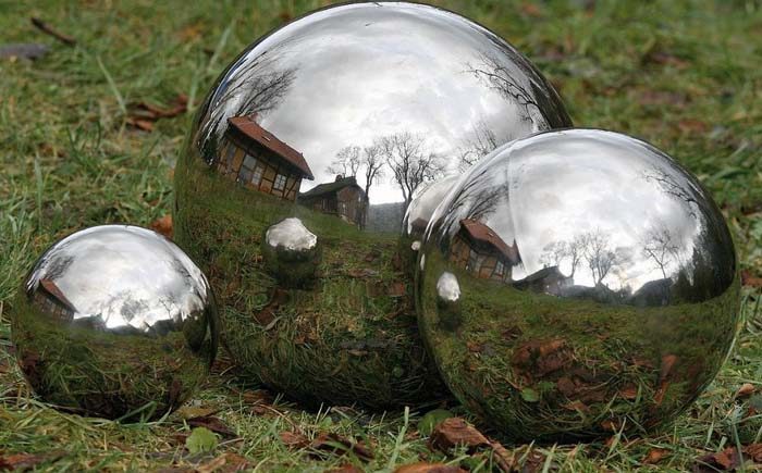 Все с той же целью, расширения пространства, можно на газоне у дома поместить ряд предметов с зеркальной поверхностью разного размера или формы.