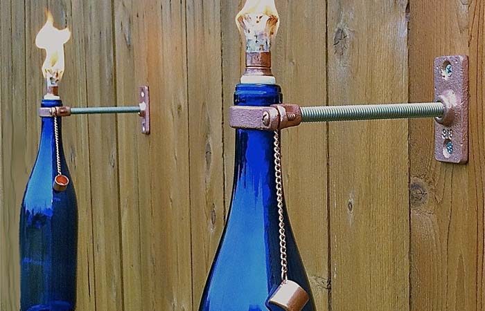 Нужно взять чистую пустую бутылку из-под вина, вставить фитиль, как в керосиновой лампе, добавить керосин и с помощью специального крепления установить на заборе по всему саду. Можно замаскировать крепления цветами или мхом.