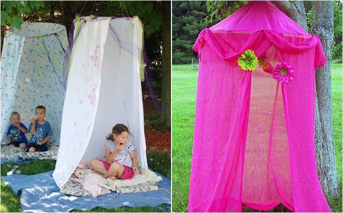 Не надо приобретать дорогой и качественный материал, чтобы соорудить палатку во дворе летом. Его функция защищать от ветра и дождя, но это совершенно бесполезные функции для палатки во дворе рядом с домом. Поэтому можно ограничиться цветной простой тканью, например, простынями.