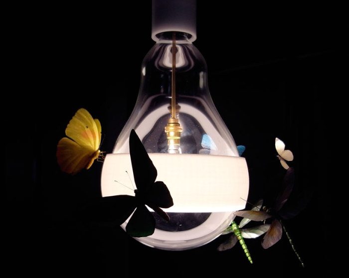 Лампы «Butterfly» — это не просто осветительные приборы, это настоящие произведения искусства. Светильник состоит из обычной галогенной лампы, обмотанной белой матовой полосой тефлона. К этой полосе с помощью игл и крепятся насекомые.