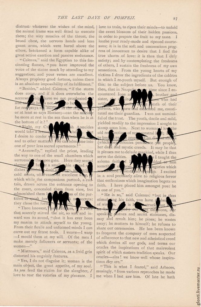 У меня во время работы появилось желание нарисовать на ней птичек, так как птичья тема в разных формах присутствует в интерьере (лампа-клетка, птица на часах, веночек-гнездо и т.д.) За основу я взяла принт с сидящими на проводах птицами.