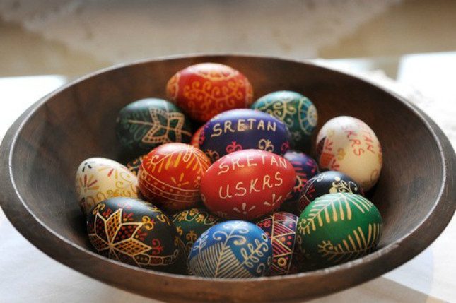 Все почти как у нас — яйца делают в основном красными, и чье не разобьется — тому в этом году светит удача.