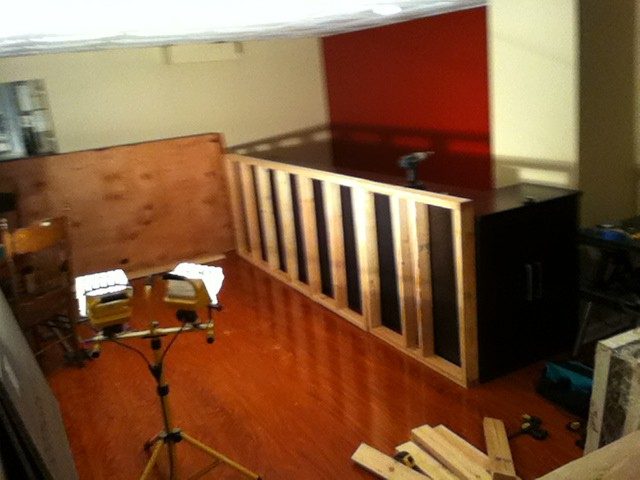 Сперва скрепил это всё одной большой фанерой, чтобы добавить устойчивости тумбам. Предварительно просверлил дыры в бетонном полу и прикрепил все часты будущей стойки к полу.