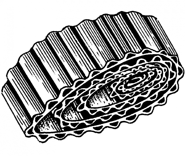 «Цилиндр» — плотно скрученная полоска. (Вовремя скручивания обратите внимание на то, что гладкая сторона полоски должна быть обращена вовнутрь, а гофрированная — наружу.) После скручивания конец полоски необходимо подклеить клеем. Если вы скрутите полоску плотно и аккуратно, то деталь будет выглядеть красивее.