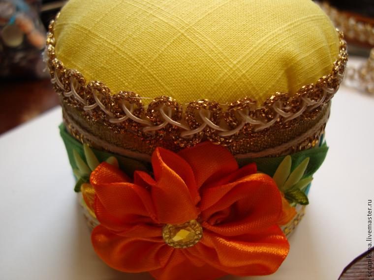 14) Край подушечки-игольницы декорируем тесьмой (на горячий пистолет). Так будет более красивый и законченный вид.