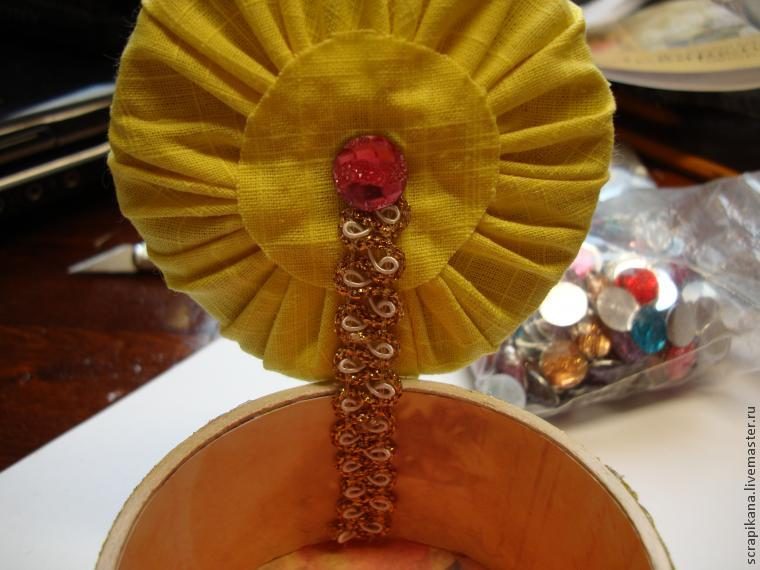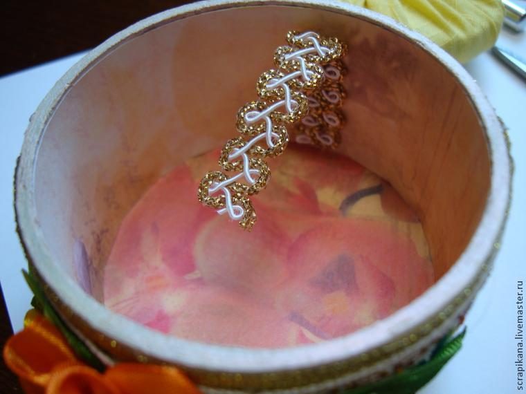6) Горячим пистолетом прикрепляем тесьму по внешней стенке шкатулки.