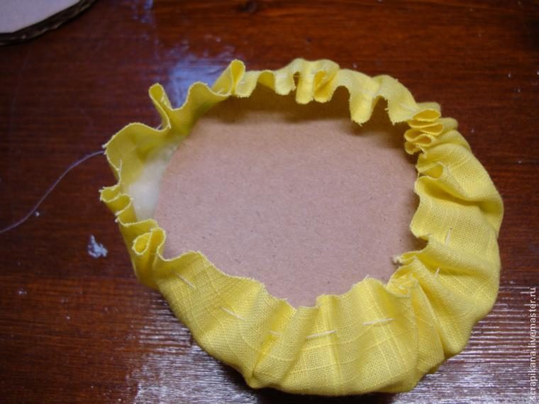 8) Теперь приступаем к крышке. Вырезаем по внешнему диаметру бобины круг из картона. И на 3,5 см больше — круг из ткани.