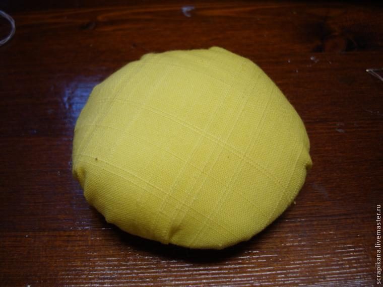 Стягиваем, а нитку закрепляем. Получилось страшненько. Поэтому я вырезала небольшой кружок из этой же ткани и горячим пистолетом приклеила в серединку. Фото увидите чуть ниже. Можно кружок из фетра прилепить, но у меня не было фетра.