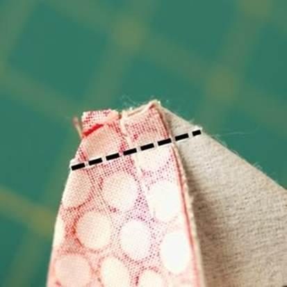Оформляем нижние уголки домика. Расправляем их, как показано на фото, и прошиваем с припуском около 0,5 см от края. Будьте внимательны, так как прошить оба угла надо симметрично друг другу.