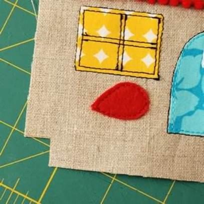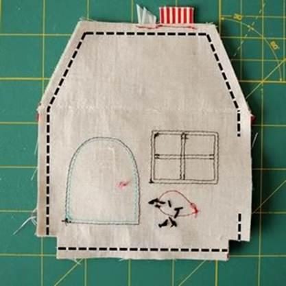 Точно также оторвите бумажный шаблон от основной части домика. Клейкой стороной наложите деталь двери на домик и прогладьте утюгом. Двухсторонний флизелин надежно скрепит слои ткани между собой, однако, проложить поверх окна и других деталей декоративную строчку на швейной машинке или вручную все же не помешает.