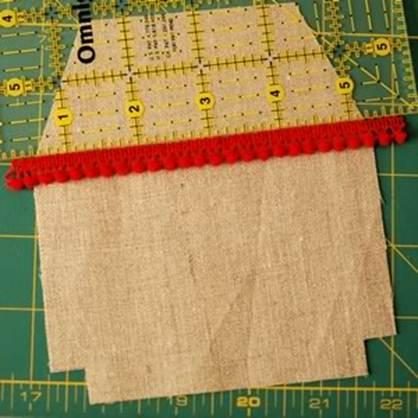Теперь можно оформлять крышу домика. С помощью линейки на лицевой стороне ткани проведите линию примерно на 3 см ниже края и чуть ниже ее приложите к ней заранее приготовленную тесьму или ленту.