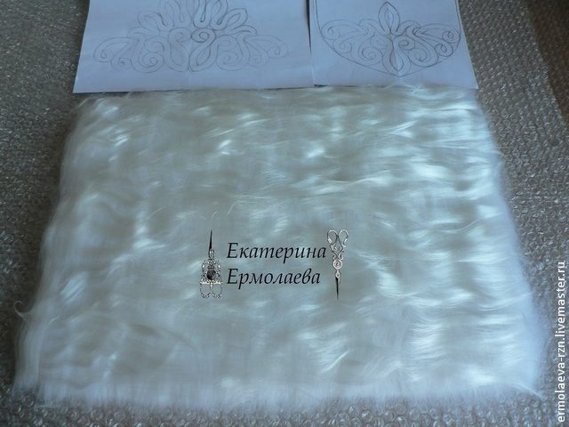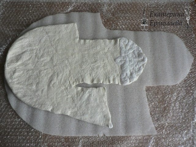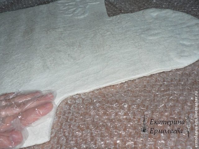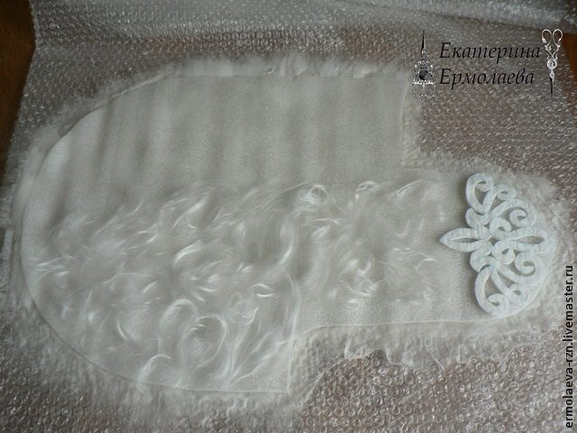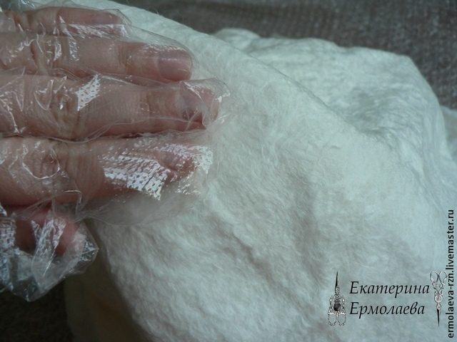 Выкладываем шерсть тонкими прядками с небольшим заходом друг на друга в ряде и с наложением рядов друг на друга на половину длины пряди. Раскладка вертикально-горизонтальная в 2 слоя. Шерсть молочно-белого оттенка.