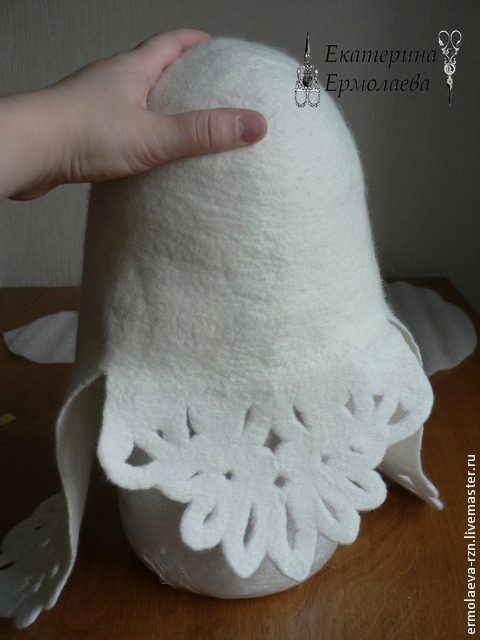 Натягиваем шапку на болванку, уточняем форму. Оставляем на ней до полного высыхания.