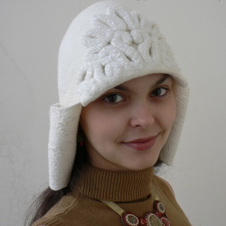Так аппликация выглядит на этом этапе, на фото видно, что она только немного привалялась к шапке, но еще не стала с ней единым целым.