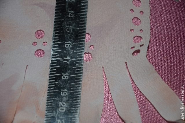 По короткому краю шарфика я сделала надрезы по прямой линейке и также повырезала кружочки.