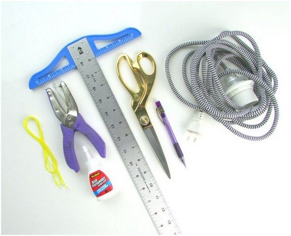 кусок обоев длиной примерно 1 метр, длинная линейка или рулетка, ножницы, карандаш, инструмент для прокалывания отверстий, примерно 1 метр веревки, разрезанной на два куска пополам, клей (по желанию), шнур электрический.