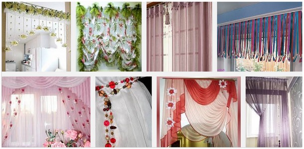 Прекрасно оживляют занавески, прошитые по краю ленты, к ним можно добавить различные пуговицы.