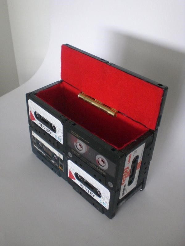 Простым и интересным кажется чемодан, сделанный из кассет. Крепления, используемые при сборке, делают его практичным для использования.