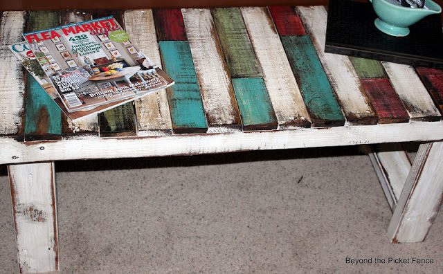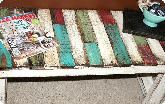 Затем отрезать оставшиеся планки из старого поддона, отшлифовать, вставить в уже существующие планки столика и все это покрасить, включая фантазию.