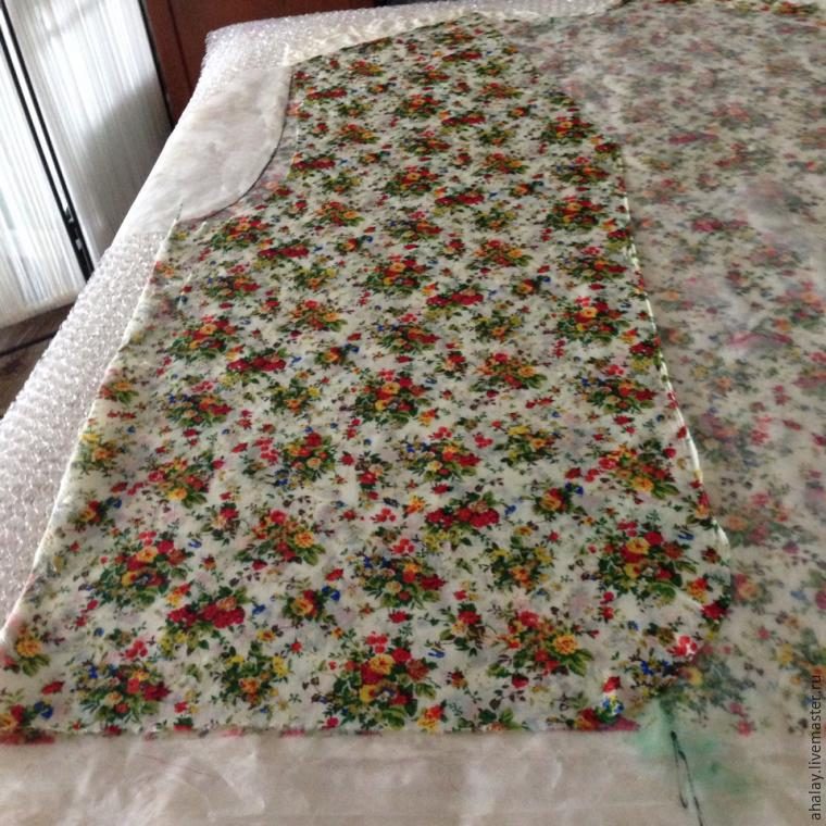 Тонкая ткань довольно прозрачна, поэтому сквозь мокрый хлопок мы видим границы пройм, горловины и низа на шаблоне. Аккуратно вырезаем ткань строго по этим границам. А вот на плечах отрезаем не впритык, а с запасом примерно 2 см. С боков ткань не отрезаем! Пусть свисает себе и ждет своего часа.