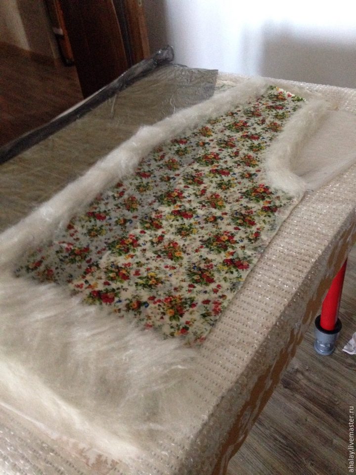 Повторяем алгоритм спинки – усиление краев, выкладка сливера паркетом, начес вискозы. Мочим, накрываем, жужжим, притираем.