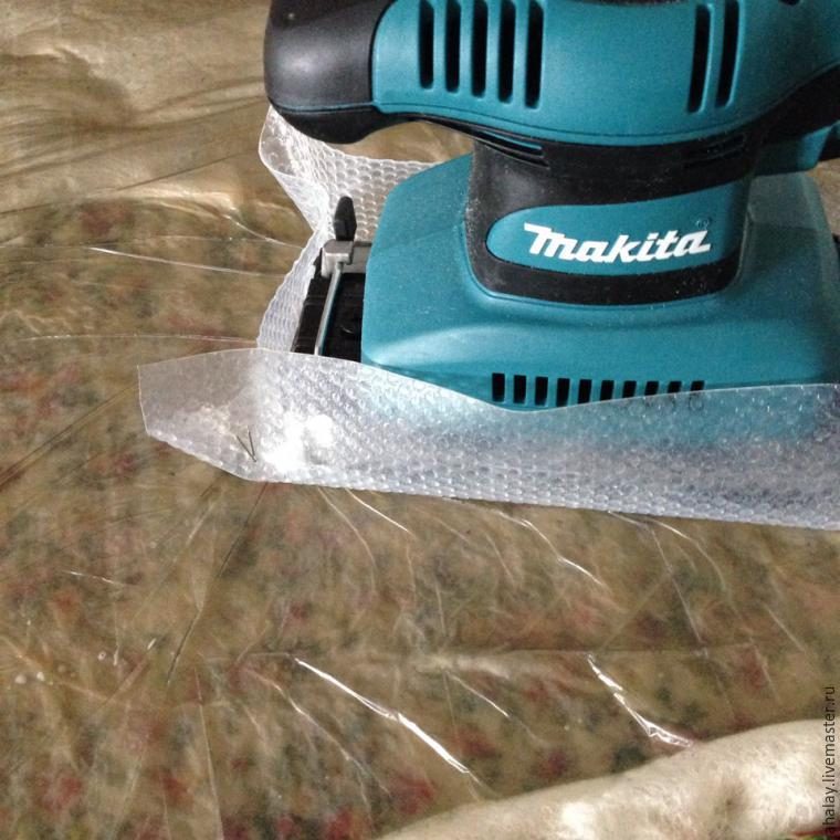 Поливаем заготовку мыльной водой, накрываем пленкой, разравниваем влагу и немного, без фанатизма проходимся машинкой по поверхности, исключая края изделия.