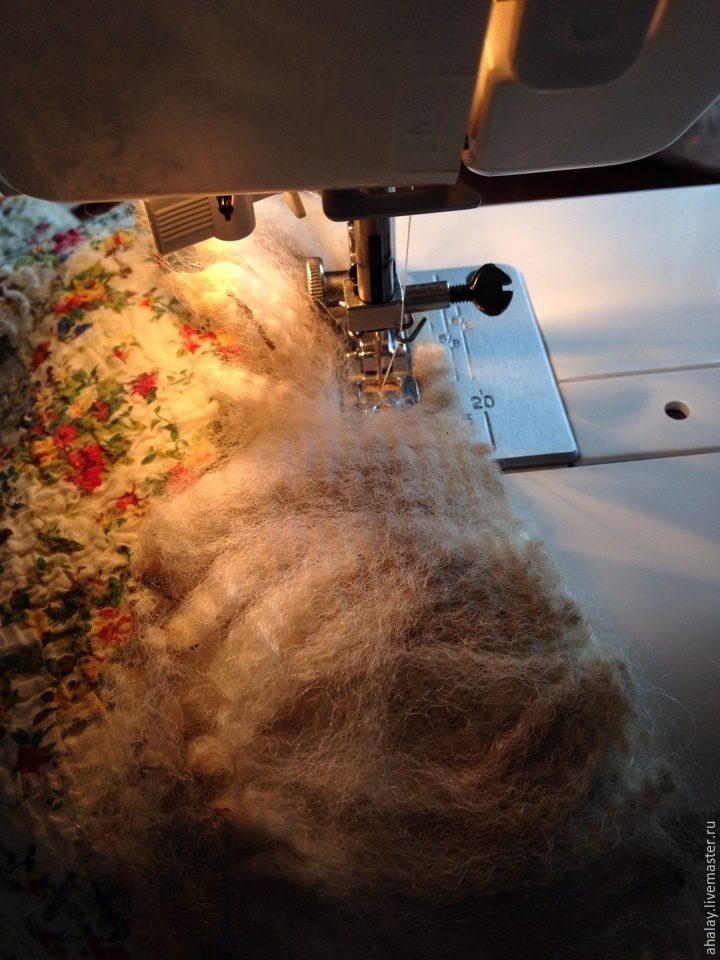 Сначала прошила флис с одной стороны, корнями наружу, отступая от края примерно 1 см. Вторую строчку проложила, отступив внутрь от предыдущей строчки примерно на 0,3 см., загнув прядки острыми концами наружу.