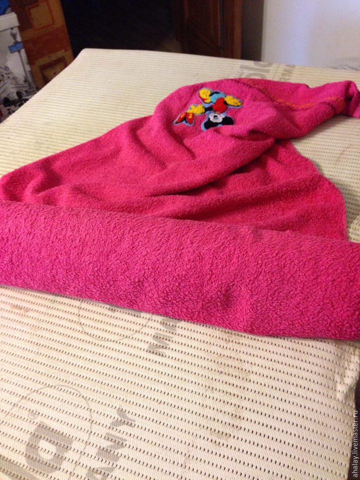 Для лучшего сцепления желательно немного покатать жилет на трубе, завернув в полотенце. Катаем с четырех сторон совсем немного, раз по 15, без лишнего нажима.