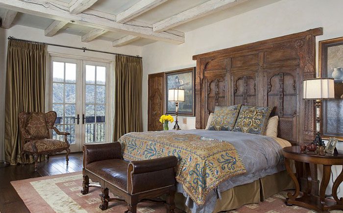 Спальня в средиземноморском стиле с изголовьем из афганского окна