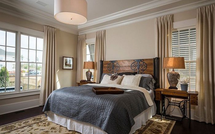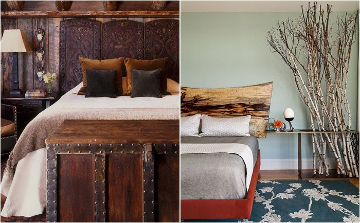 Деревянное изголовье в рустикальном стиле можно создать даже собственными руками, используя куски бывшего в употреблении дерева или даже лесоматериал, найденный у дома. Некоторые дизайнеры успешно приспосабливают старые двери и высохшие ветки. Не имеет значения, из чего получится изголовье, в любом случае оно станет центром всеобщего внимания.