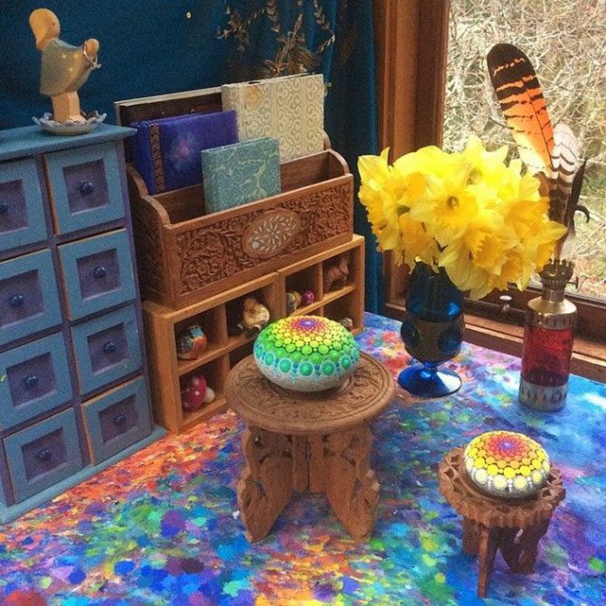 Элспет Маклин рисует акриловыми красками, нанося изображение в виде точек. Техника подобна медитации – даёт возможность погрузиться в умиротворенное состояние, разбудить своего внутреннего ребёнка, который искренне радуется буйству красок и совершенству форм. «Я предпочитаю сосредотачиваться на возвышенных и прекрасных объектах, тьмы и так слишком много в этом мире», – убеждена Элспет.