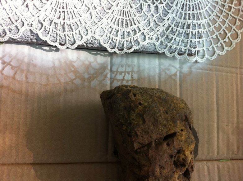 …Придется пожертвовать одной бабушкиной вязанной салфеткой. Либо подыскать в магазинах похожие бумажные или пластиковые салфетки. К слову – можно вообще использовать любой трафарет, какой сможете подыскать, и какой вам будет по душе. Хоть трафарет алфавита! ))) Можно, в этом случае, на наших камнях изложить цитаты или свои умные мысли.