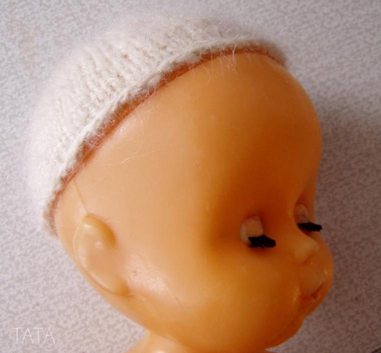 Для волос у меня нашлась белая пушистая мохеровая пряжа, вяжем паричок на спицах или крючком, в размер снятой «черепушки»: