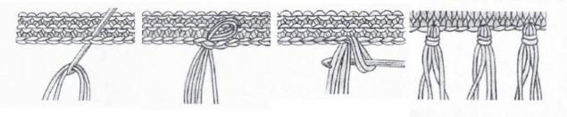 Затем начинаем вдевать в паричок волосики — нарезаем из той же пряжи пучок волос нужной длины (длина одной ниточки равна длине двух волосинок плюс 3-4 см). Волосы вставляем крючком вот по этой схеме, только берем не по две нити, а по одной. Нить берем за середину, протягиваем петлю через паричок, а затем концы нити протягиваем в эту петлю: