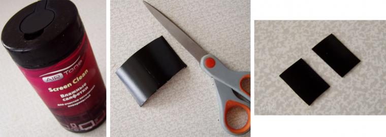 Из пластмассовой баночки ножницами вырезаем два прямоугольника такой же ширины, как и прорези для ресниц в веках.