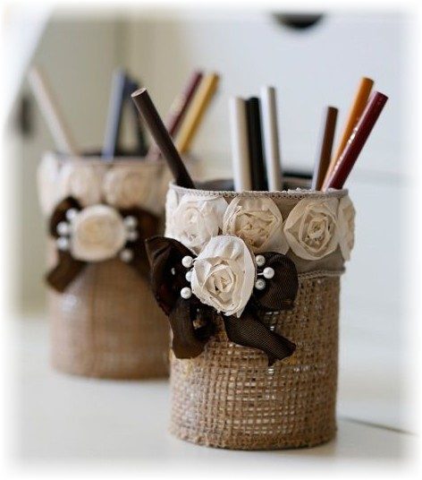 Мало кому нравится искать везде ручку или карандаш, когда они очень нужны. Так почему бы не сделать поделки из мешковины – держатель для карандашей, чтобы решить эту проблему. Для такого держателя понадобится мешковина, ленты и декоративные булавки. Основной элемент, который будет использован в поделке из мешковины, это консервная банка.